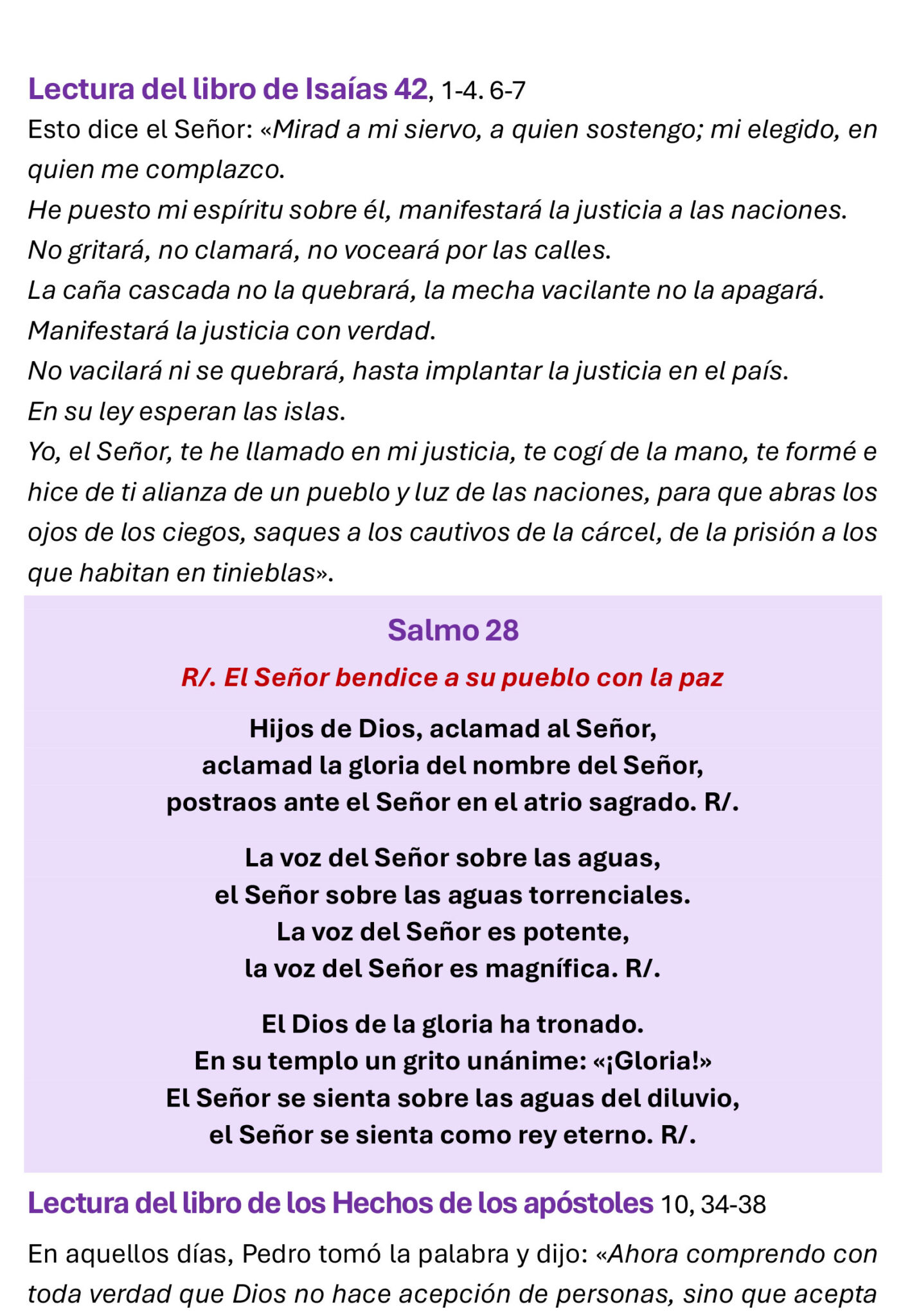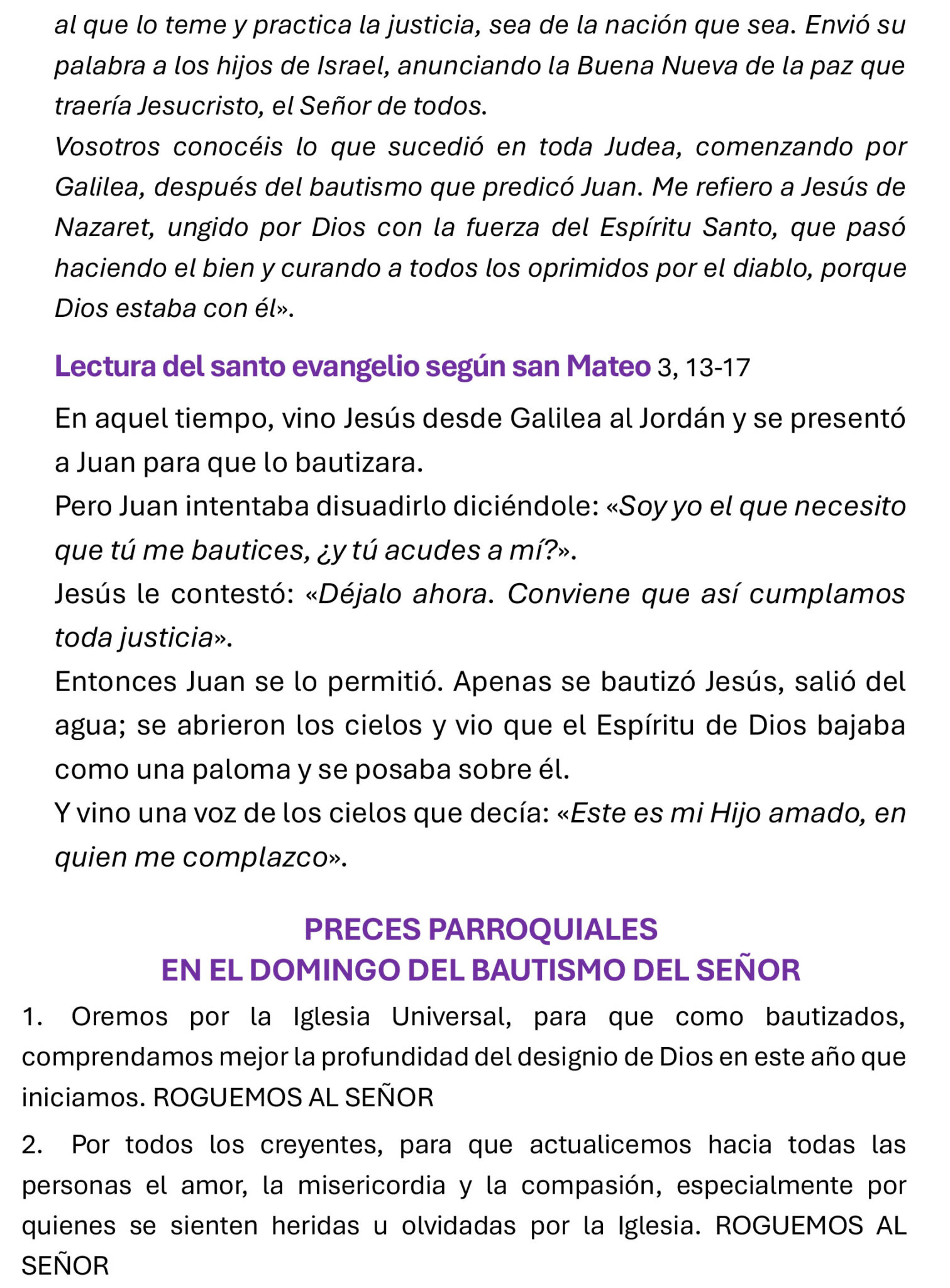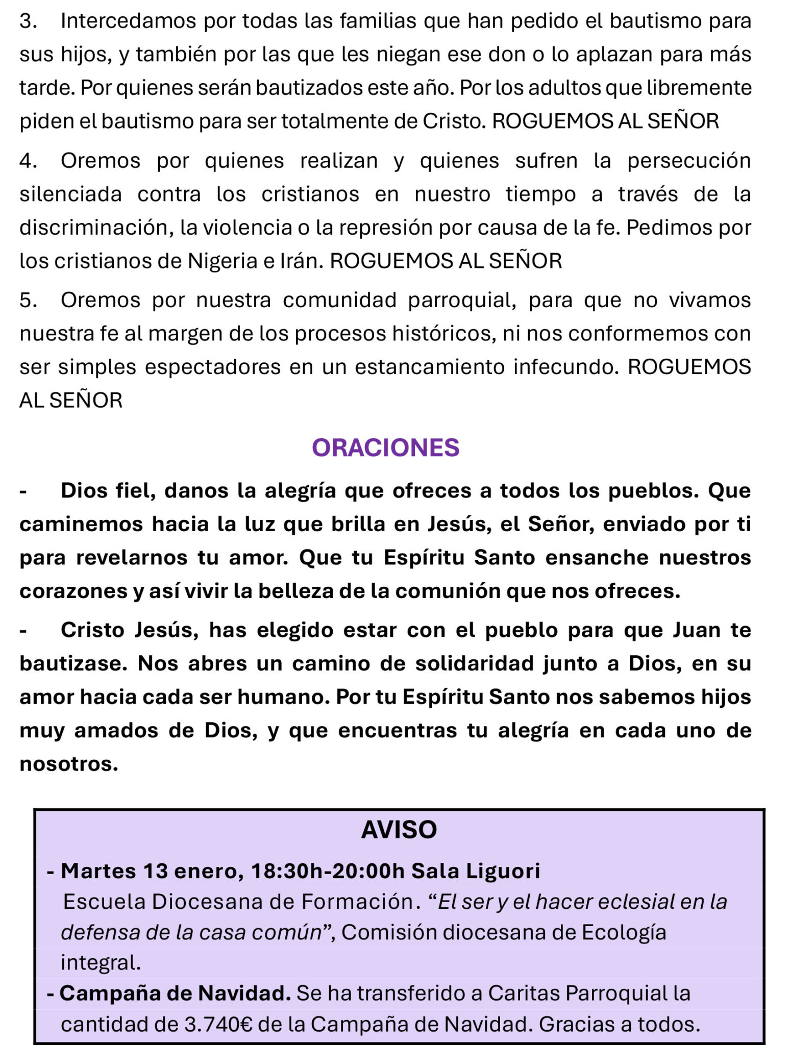 Jesús comienza su vida pública. Nosotros retomamos la ruta de este año 2026. Celebramos el bautismo de Jesús. A nosotros, por el Bautismo, nos hace hijos de Dios. El Sínodo de la Sinodalidad nos lo ha recordado a todos, seas de la confesión que seas. El bautismo nos hace a todos hijos amados de Dios. Por él hemos sido insertados en la familia de los hijos de Dios y recibido el Espíritu Santo, asumamos con responsabilidad la proclamación del Evangelio.